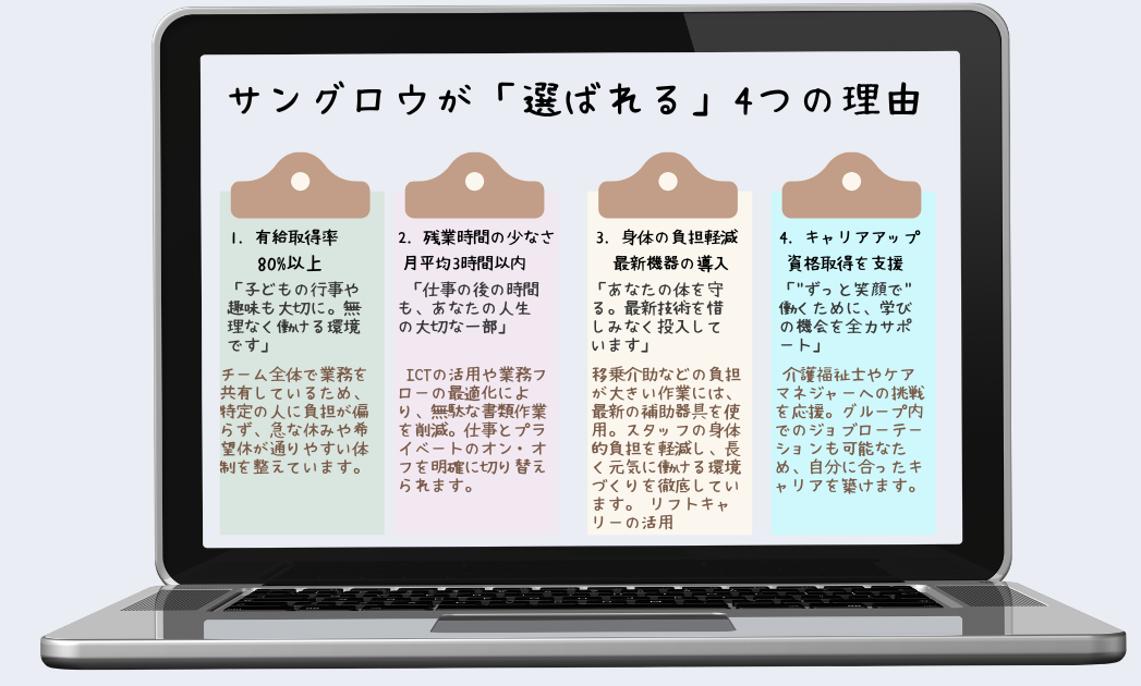 採用の費用を抑えることで、入社してくださったスタッフが、長く安心して働いていただける職場づくりと、利用者様に喜んでいただけるサービスの充実に投資したいと思っているからです。