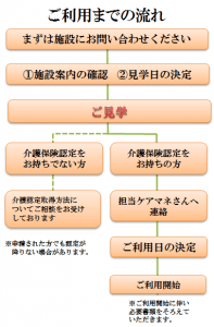 デイサービスかがやきへお電話で、「サービスを受けたいです。」ということをお伝え下さい。